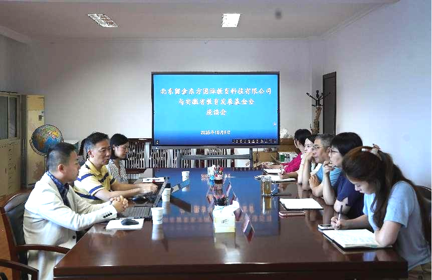 10月9日下午,安徽省教育发展基金会战略合作伙伴北京留金东方国际教育科技有限公司董事胡小芃一行来基金会调研座谈,双方围绕自今年上半年签订战略合作协议以来的合作成果系统复盘交流,并就下一步项目设计和深化合作展开深入探讨。基金会秘书长王忠、副秘书长李永红及秘书处有关人员参加会议。