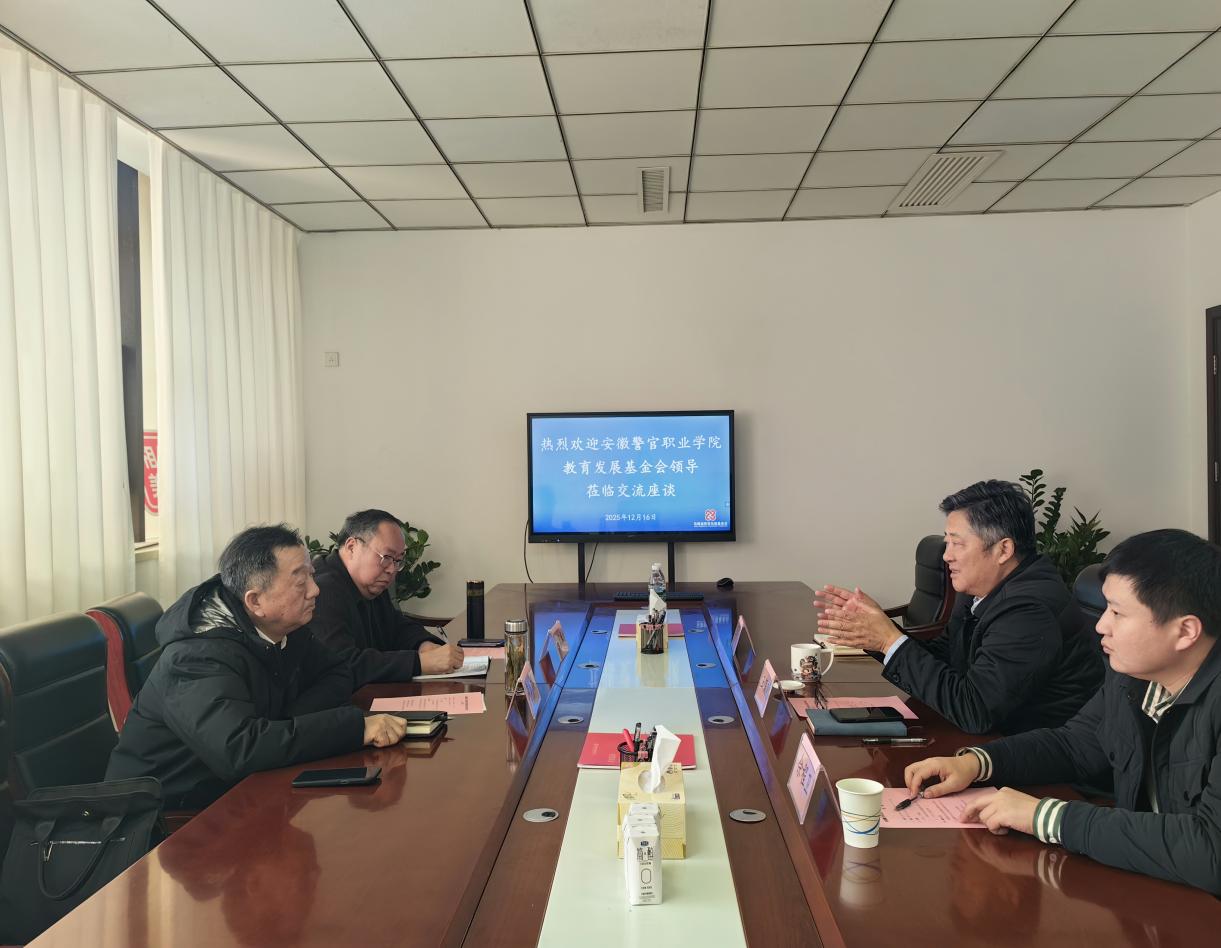 12月16日下午,安徽警官职业学院教育发展基金会理事长蒋红旗、秘书长汪家兵一行到基金会座谈交流。基金会理事长王佩刚、副秘书长佘程卫及秘书处有关人员参与座谈。