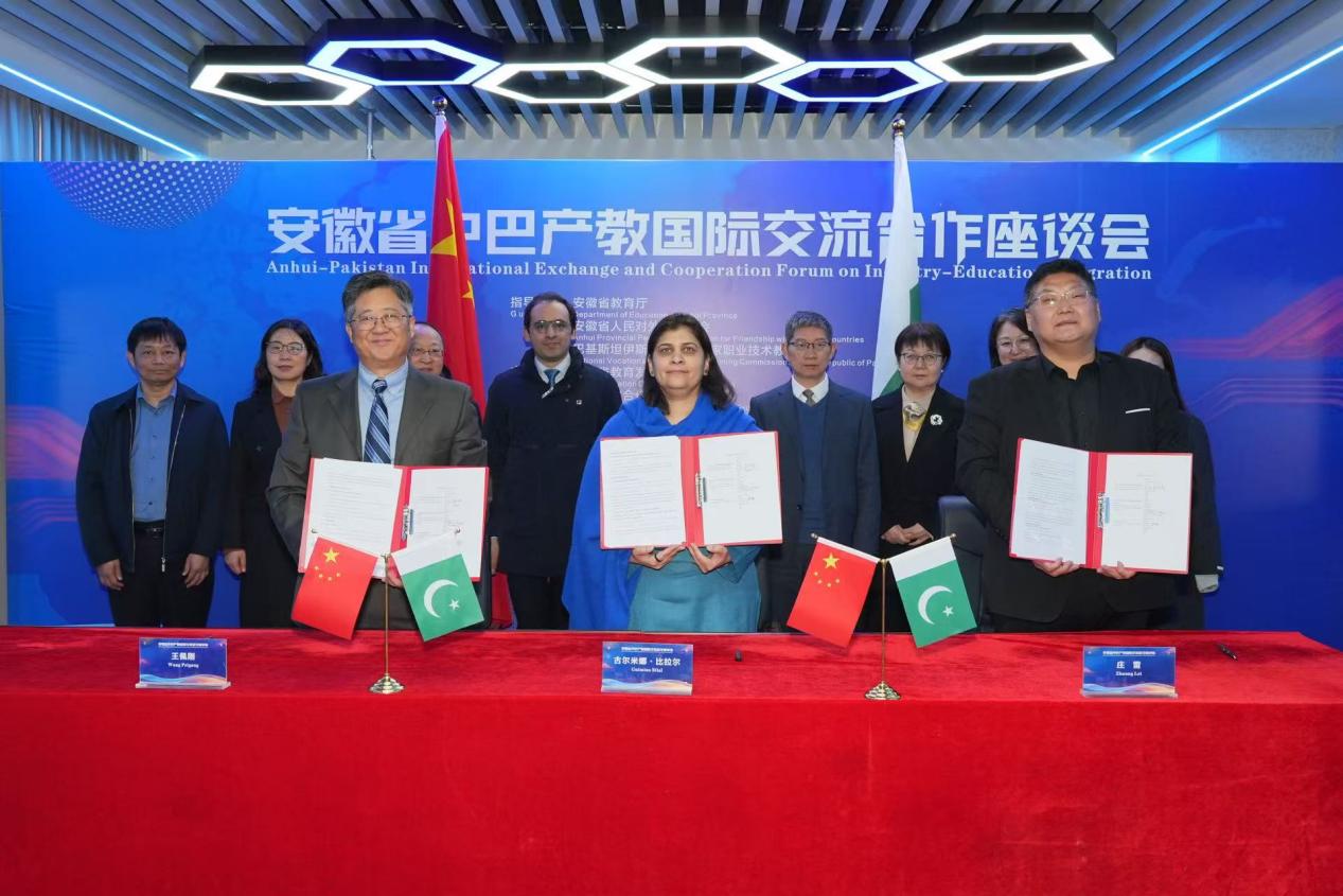 座谈会上,古尔米娜·比拉尔介绍了巴基斯坦职业教育发展现状与愿景,高度评价中巴职教合作前景,期待通过此次交流推动巴基斯坦技术教育升级。来自合肥工业大学、安徽中医药大学、黄山学院、芜湖职业技术大学、安徽职业技术大学、池州职业技术学院及安徽交通职业技术学院7所院校的专家学者参与交流研讨。巴基斯坦国家职业技术教育委员会、安徽省教育发展基金会、中巴产教合作卓越中心签署三方谅解备忘录,与省内九所院校共同签署四方谅解备忘录,明确合作框架与实施机制,达成多项合作意向。