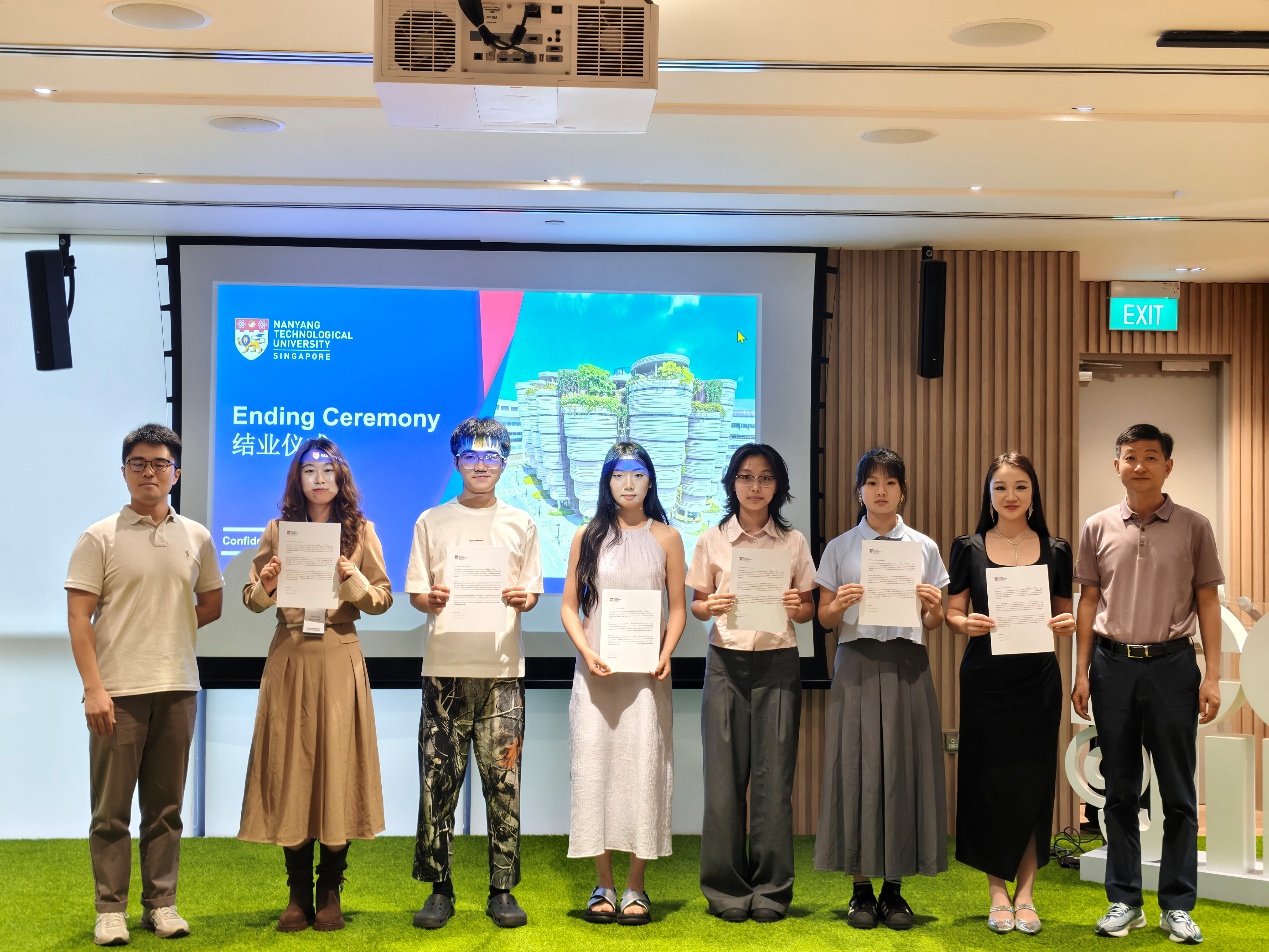 在结业汇报中,学生们分成六个小组,围绕“新时代下,中国与新加坡合作新图景”主题,结合研学课程知识与全球现实议题,提出创新视角与解决方案,进行了路演答辩。所有学员被授予项目结业证书,优秀学员获得了南洋理工大学推荐信和优秀学员证书。